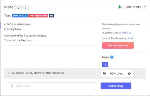 March 14-28, 2023 UTCに開催されたpicoCTF 2023 に個人で参加した。 簡単な問題を軸に24/45問解いたので、特に印象的だった3問のWriteupを記載する。 Web More SQLi 指定されたURLへアクセスするとログイン画面が表示される。 問題文よりSQLインジェクショ…